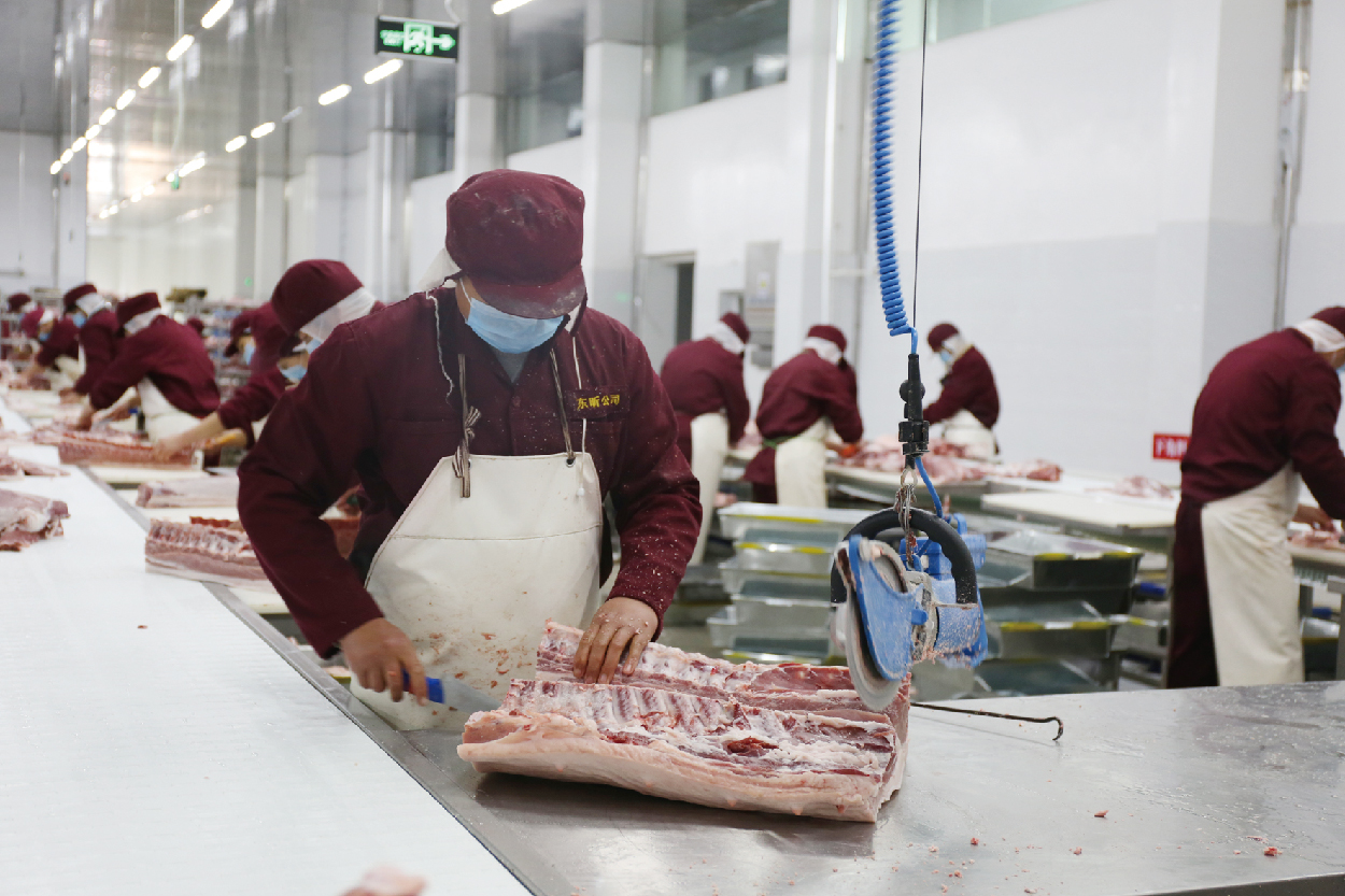 如意餛飩中用到的豬肉,也正是在這個車間分割出來的整塊豬前腿肉。因為豬前腿肉的纖維短、活動量大、油花的分布非常均勻,既不油膩又不柴澀,是做餛飩餡兒的不二之選。
